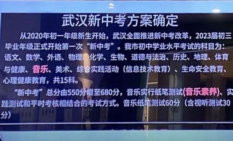 武汉也积极响应国家号召,公布了“新中考”方案:“新中考”总分由550分增至680分,音乐实行纸笔测试(音乐素养),实践测试和平时考核相结合的考试方式。音乐纸笔测试60分(含视听测试30分)。