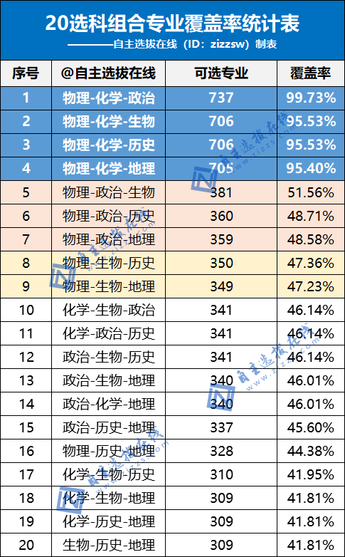 2.物理+化学+其他的组合方式几乎“无敌”,其他=政治/生物/历史/地理任一时,之间仅有着极为细微的差别。政治的更高覆盖率则主要体现在公安、马克思主义等法学门类,考生根据自身情况四选一即可。