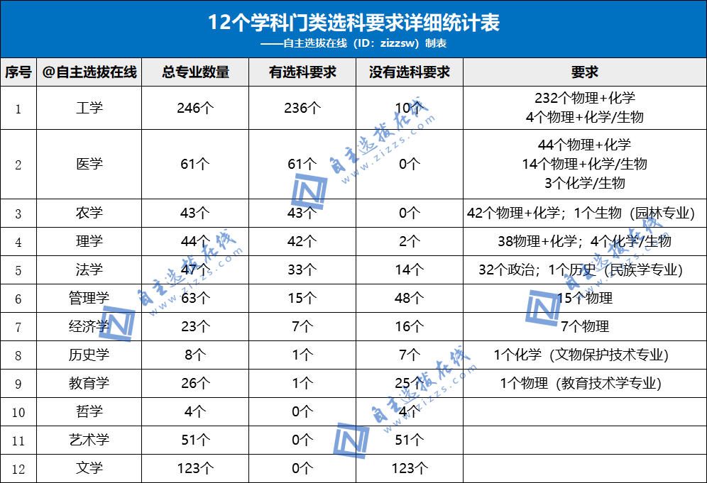 从上表中,我们不难看出12个学科门类的专业要求情况有着鲜明的对比。医学、农学中有专业要求的高达100%;工学中有专业要求的高达96%;此外,哲学、艺术学、文学并没有做出选科要求,考生自主选择空间大。