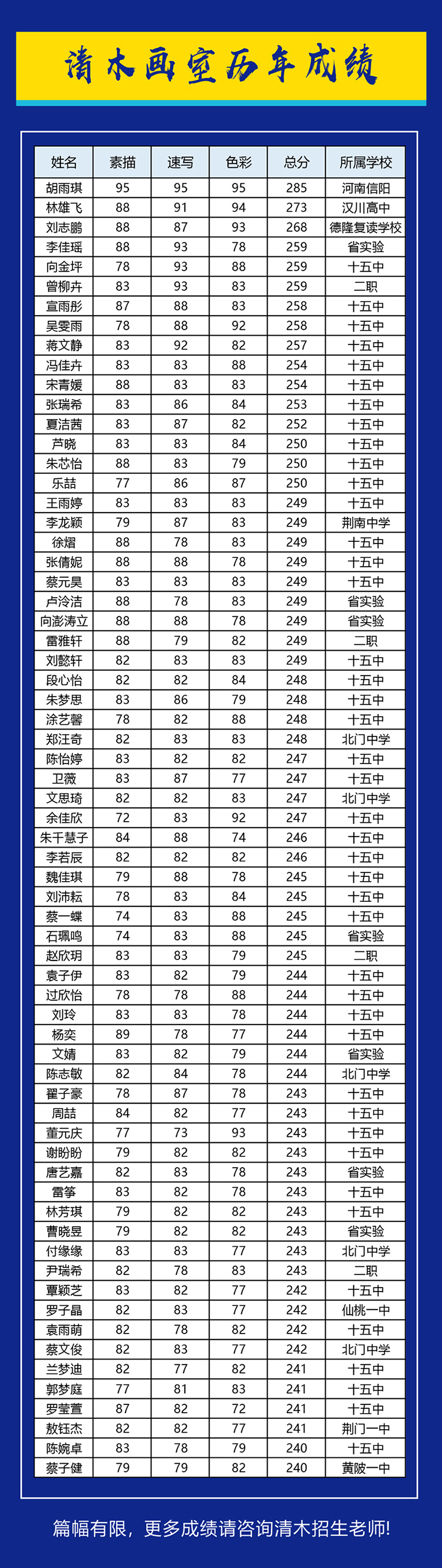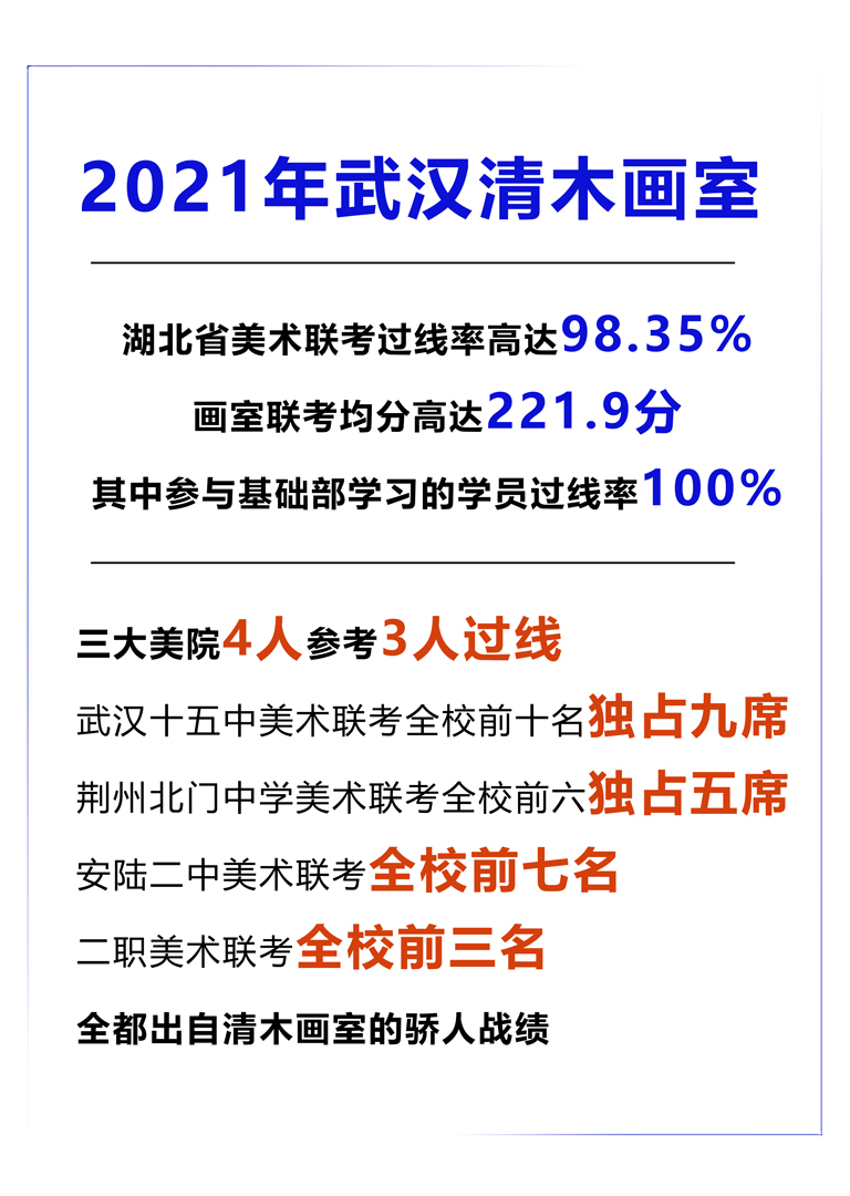 武汉清木画室成立于2009年前身为武汉清美园画室由多位资深艺考教师联合创办。本着修人惠己、笃行致远、尚美求真、知行合一的办学宗旨。是湖北省武汉市少数具备正规培训学校资质的美术培训机构之一。深耕美术基础教育与高考美术教育十余年,为各大985,211高校和九大美院输送学生数千人。